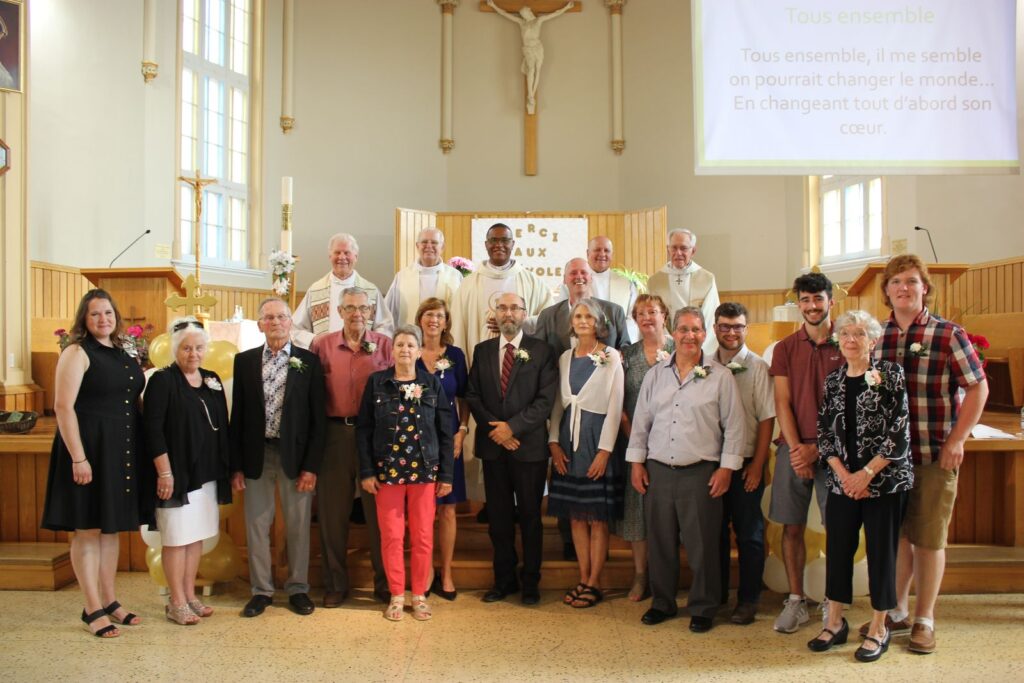 Le 12 juin dernier avait lieu une célébration pour les mérites laïcs des six paroisses du Comité du Soleil Levant : Chute-à-Blondeau, L’Orignal, Sainte-Anne de Prescott, Saint-Bernardin, Saint-Eugène et Vankleek Hill. Félicitations à tous ces bénévoles qui donnent généreusement de leur temps, de leur énergie pour leur paroisse respective. Provenant de l’École secondaire catholique régionale de Hawkesbury, une enseignante, Mme Karine Charlebois, ainsi que deux élèves, Caleb Hawkins et Antoine Lucas, se sont également démarqués par leur engagement et leur implication dans la communauté scolaire et pastorale. Dans la photo, prise à l’église de Saint-Eugène, (de gauche à droite) Karine Charlebois, Agatha et Rolland Poirier, Guy Larocque, Denise Lalonde, Diane Sauvé, Jean Denis Méthot, Line et Richard Durocher, Colombe, Roch et Alexis Geneau, Caleb Hawkins, Thérèse Boyer et Antoine Lucas. Les prêtres à l’arrière : Gilles Marcil, Serge Faucher, Pierre Domerson, Mgr Léo Villeneuve et Mgr Gérard St-Denis.