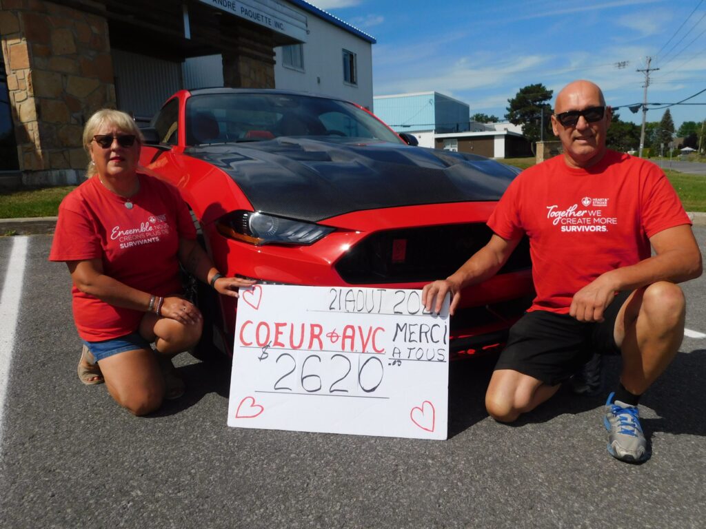Alain Brazeau et Manon Desjardins, avec leur Mustang GT 2021, exhibent le chèque au montant de 2 620$, recueillis lors de la Randonnée du cœur et de l’AVC, le 21 août, au profit de la Fondation des maladies du cœur. L’événement, organisé à la mémoire de leur fils Jécy, a vu plus de 60 conducteurs partir de chez Herb’s Travel Plaza, à Vankleek Hill, pour un trajet de 200 kilomètres, passant par Cornwall et se terminant à Rigaud, au Québec.