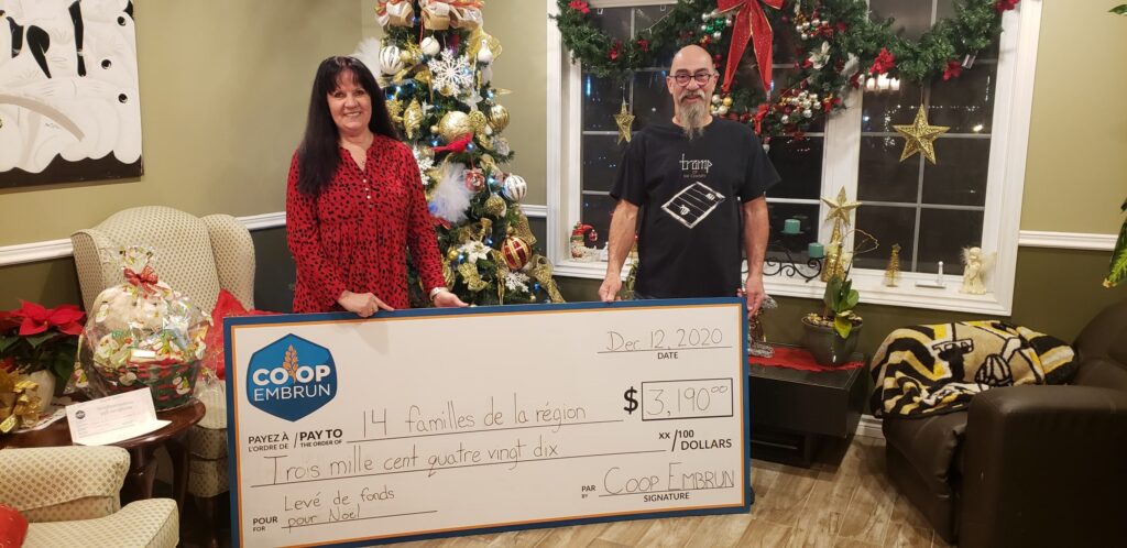 Giovanni Damato, qui est un employé dans la division de la moulée de la Coopérative d’Embrun, a parlé de son projet au directeur général de la coopérative, Patrick Therrien. La coopérative a donc remis 1000 dollars. Ce sont donc 14 familles de la région qui pourront avoir une épicerie, grâce à la générosité de M. Damato et de ses donateurs.